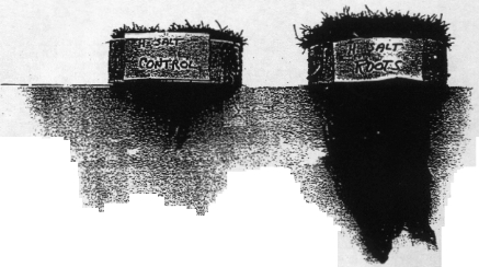 The enclosed pictures were taken last week. Bentgrass was treated in the field this summer with. ROOTS®. Three weeks later four-inch plugs were sampled from treated and control plots and placed in rooting. rings (four- inch diameter plastic rings with wire mesh bottoms) - The plugs were then irrigated with heavy salty water. After six weeks root growth was measured. The enclosed pictures represent the data. Conclusion, bentgrass treated with Roots negates injury caused by irrigation with salt water. In fact it appears that Roots actually stimulated root development in spite of being irrigated with salty water (estimated over 100 lbs of salt was applied per 1000 sq. ft. during the duration of the experiment). R.. E.. Schmidt