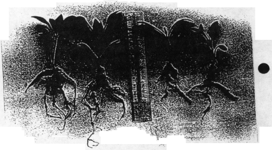 Figure 9. Effects of ROOTStm upon root, shoot and root hair develoPment of dahlia ‘Redskin’. The best and worst of the treated dahlias from a flat of 12 is shown on the left. The best and worst controls are on the right.